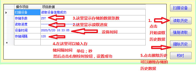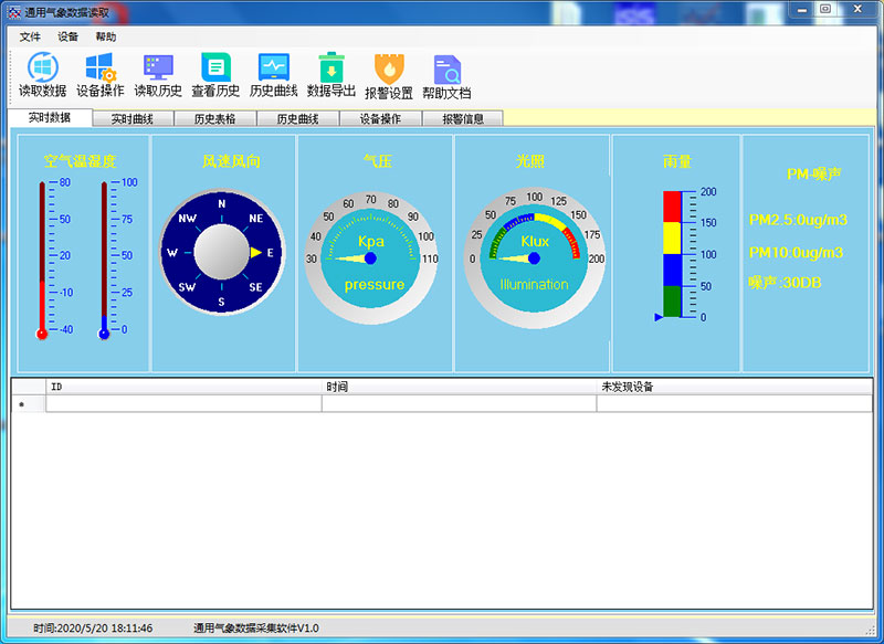 點(diǎn)擊右側(cè)的刷新,在串口號(hào)后面選擇剛才查看到的COM口號(hào),點(diǎn)擊查找,此時(shí)軟件會(huì)識(shí)別到設(shè)備信息,并在左側(cè)顯示出來(lái)。①讀取數(shù)據(jù),可以觀察到傳感器的實(shí)時(shí)數(shù)據(jù)。②讀取歷史數(shù)據(jù):點(diǎn)擊讀取歷史可讀取歷史數(shù)據(jù)